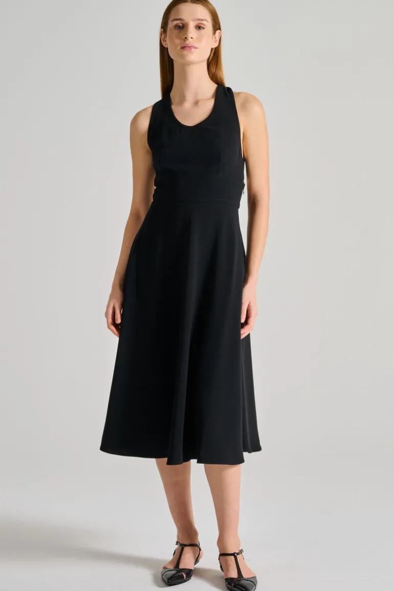 Realizzato con attenzione ai dettagli, l’abito offre una vestibilità impeccabile, assicurando comfort e stile. Perfetto da abbinare a accessori eleganti o casual, è un must-have nel guardaroba di ogni donna. La tonalità nera lo rende versatile e facilmente abbinabile a diverse occasioni, dal lavoro a eventi serali.