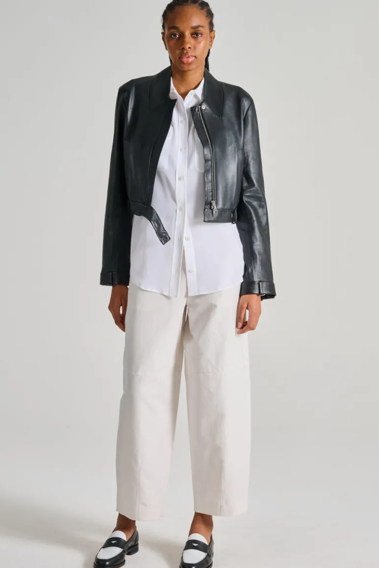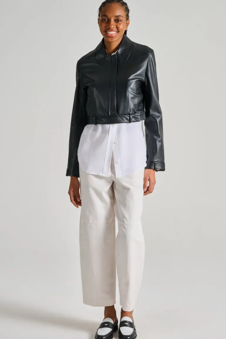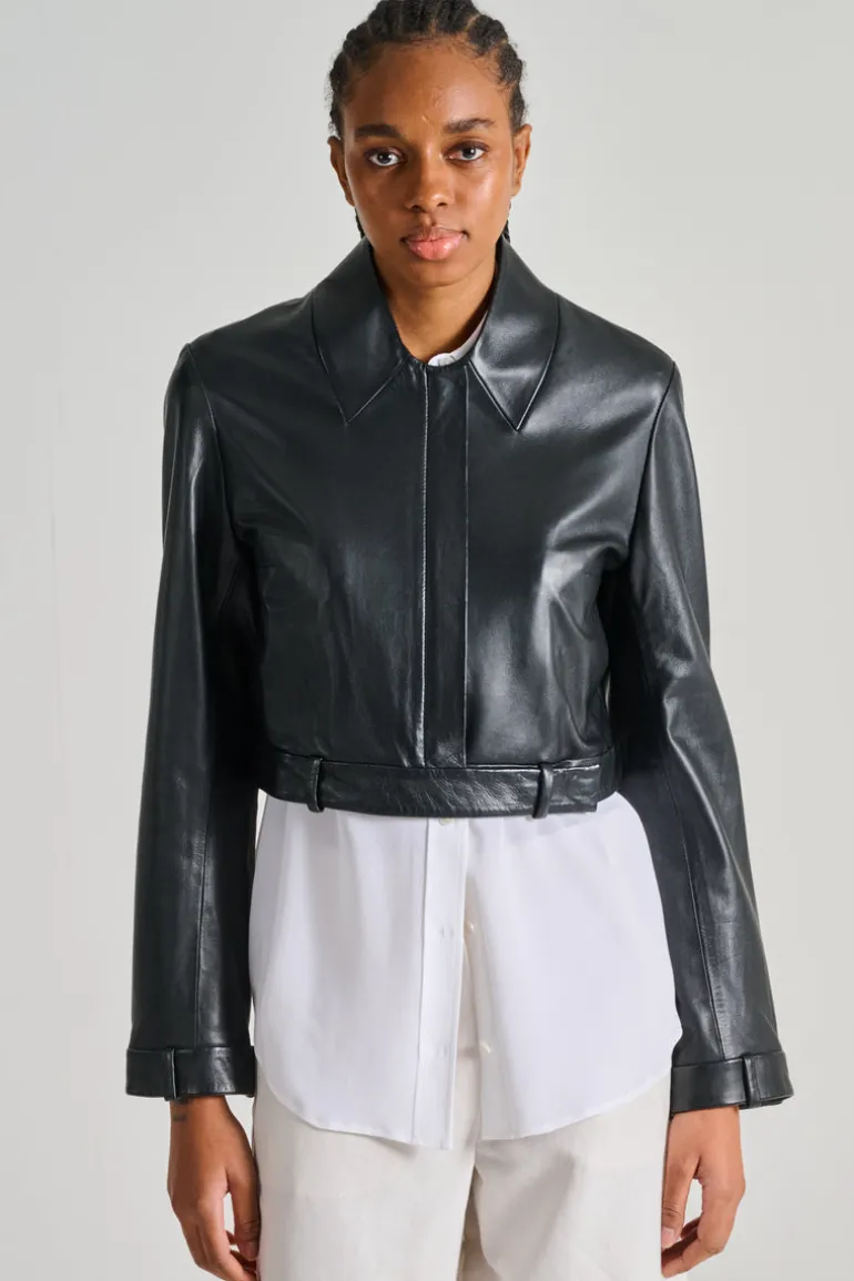 Scopri l’eleganza senza tempo della giacca in pelle nera, un must-have nel guardaroba di ogni donna. Realizzata dal brand Sword, questa giacca unisce stile e versatilità, perfetta per ogni occasione.