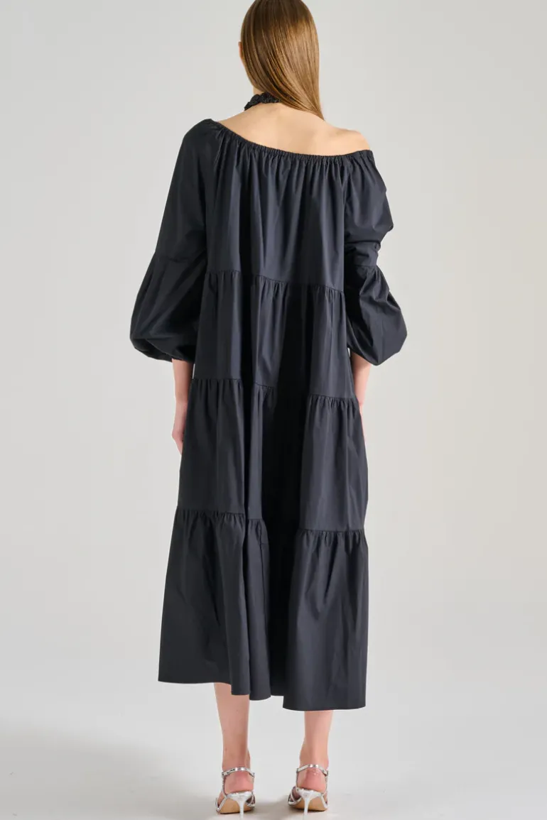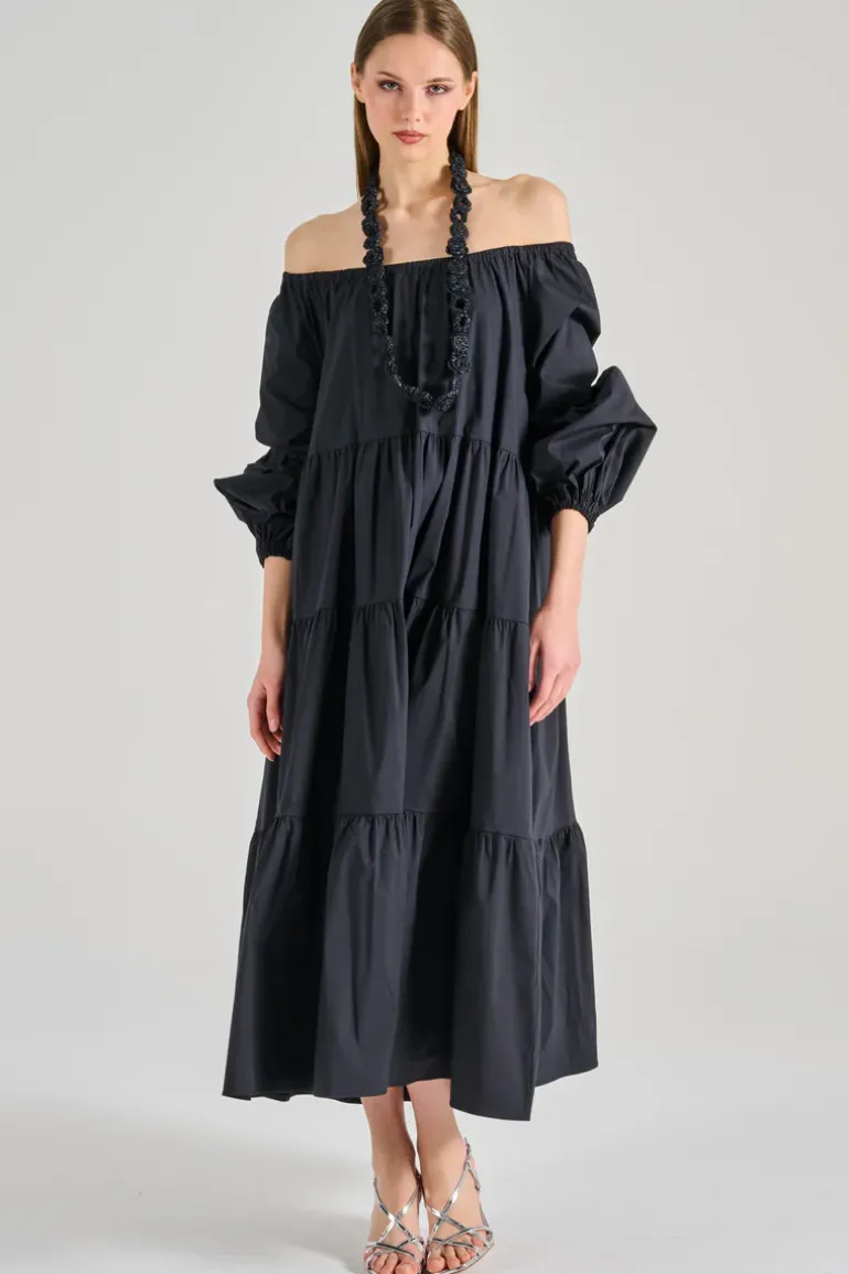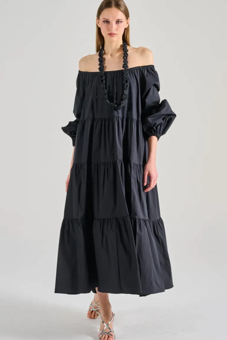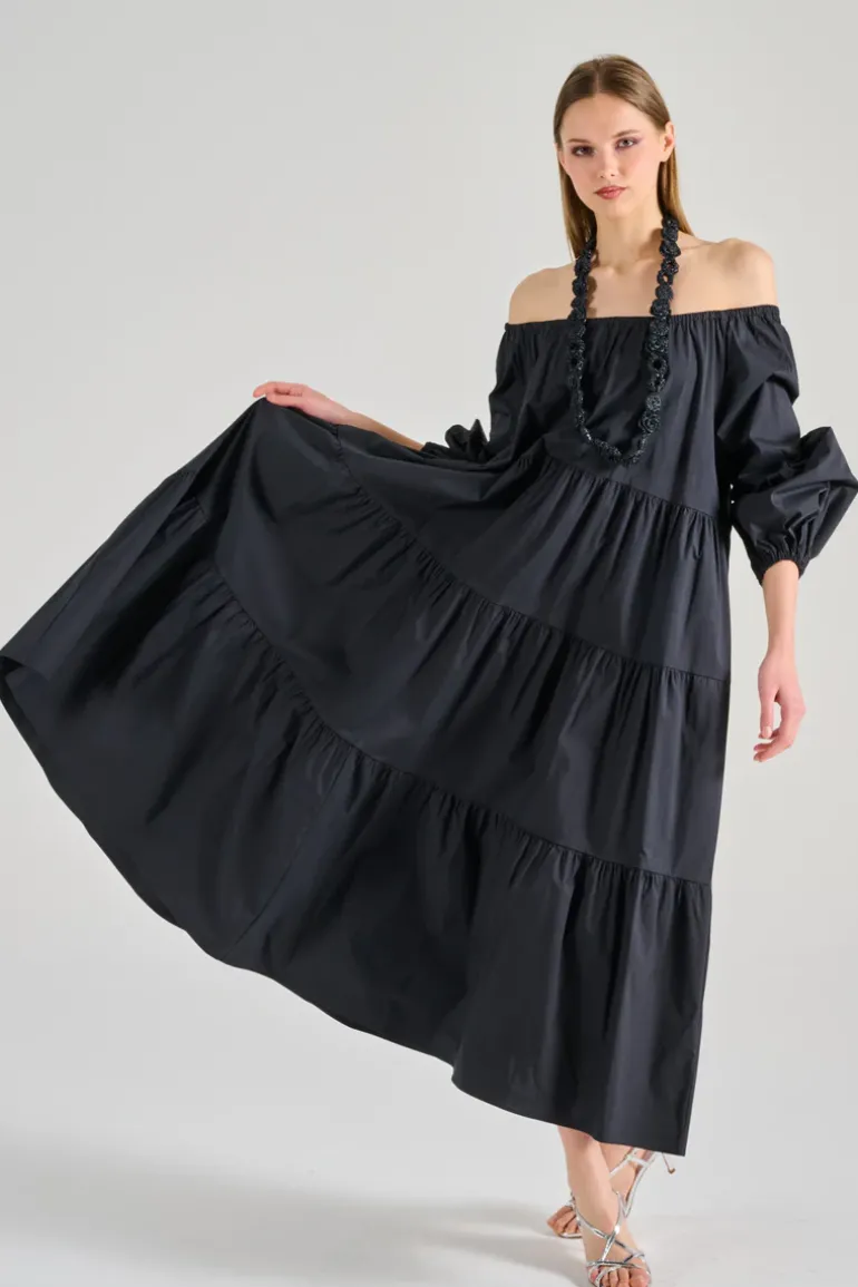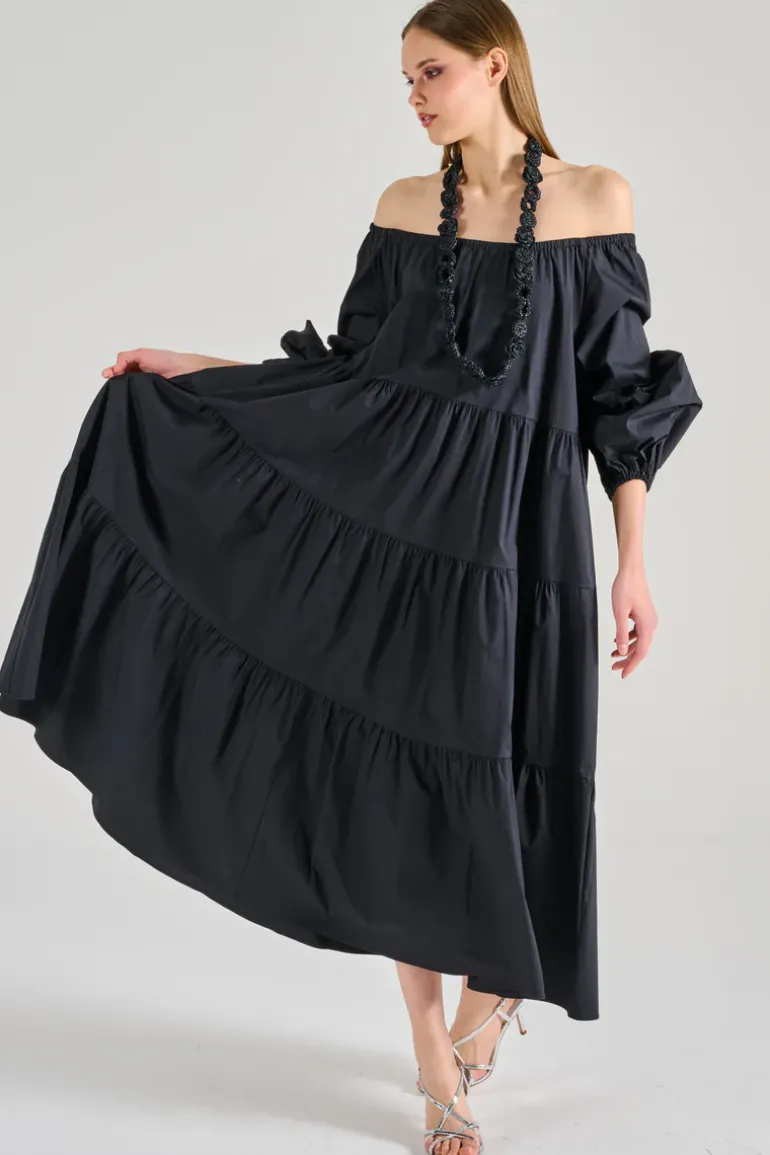 La tonalità nera conferisce un aspetto raffinato e permette di abbinarlo facilmente a vari accessori e calzature. Perfetto per ogni stagione, questo abito si distingue per il suo design unico e la sua vestibilità impeccabile, adattandosi perfettamente alla silhouette femminile.