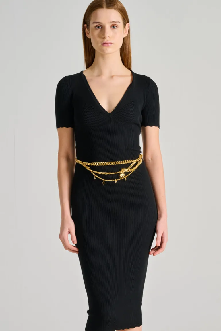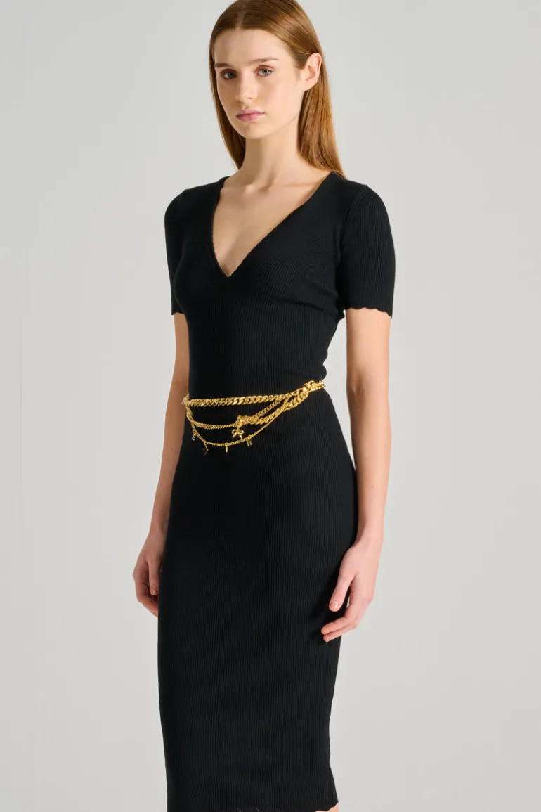 Presentiamo l’abito di maglia nero da donna realizzato da Elisabetta Franchi, un capo d’abbigliamento che unisce eleganza e versatilità. Questo abito è perfetto per diverse occasioni, dalla giornata in ufficio a serate più formali.