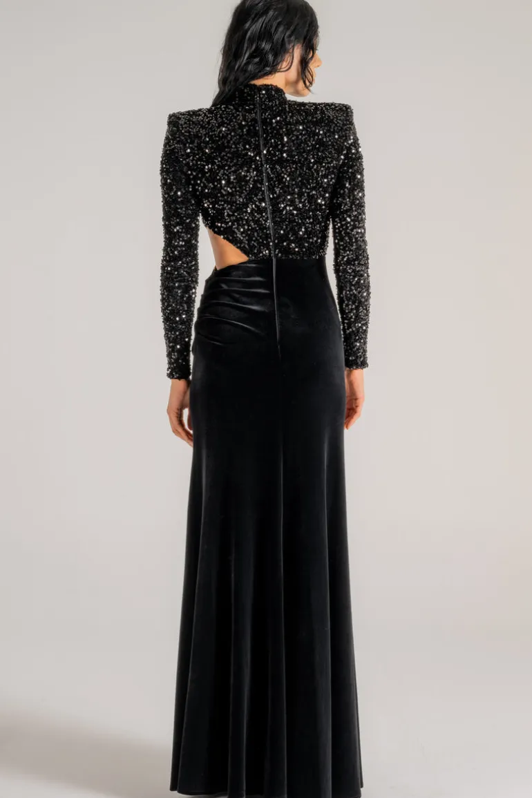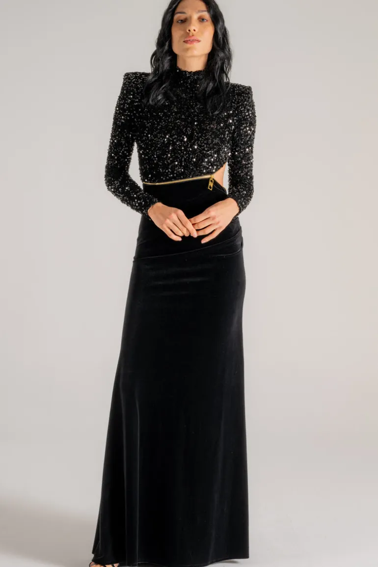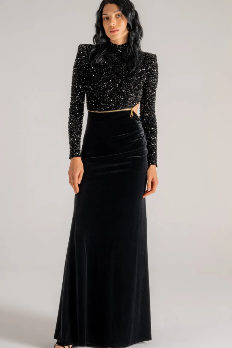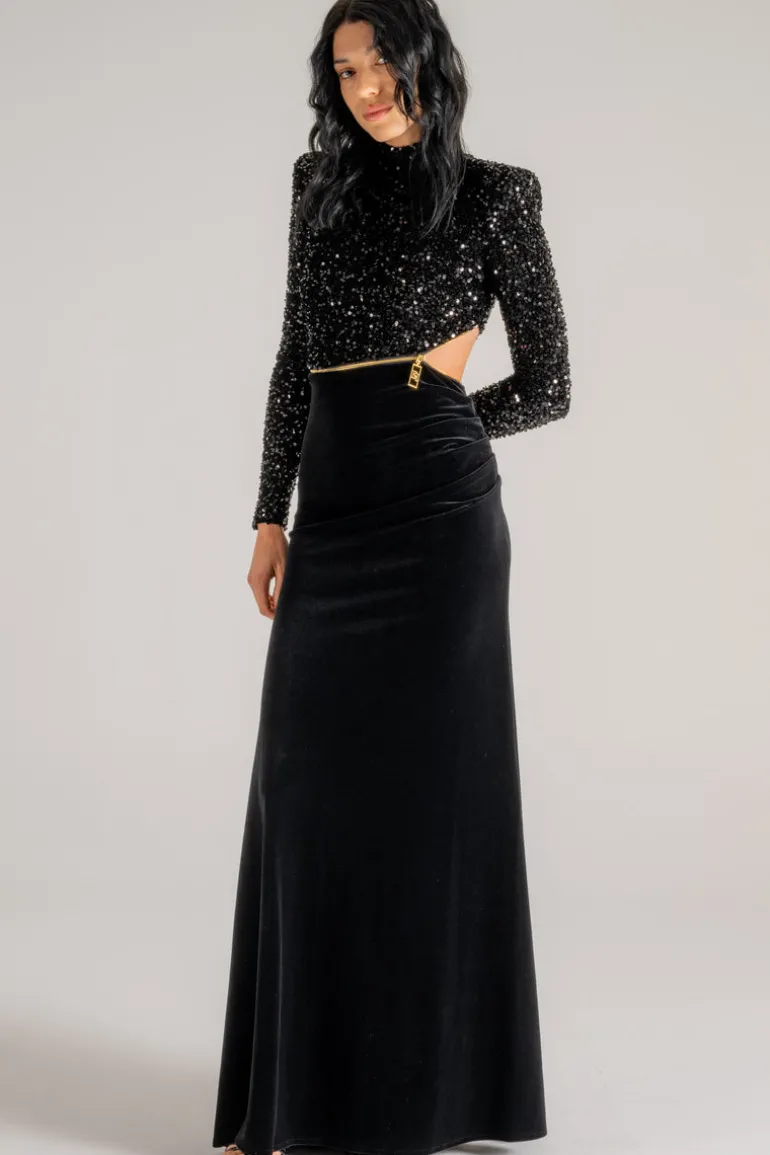Cerca di valorizzare questo abito con tacchi alti dallo stesso tono oro dei dettagli. Aggiungi un tracolla su misura per un look elegante e sofisticato.