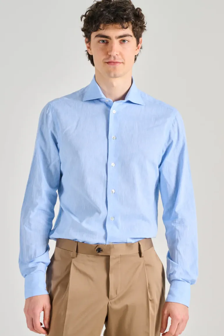 Scopri la camicia in cotone e lino di Borriello, un capo versatile e fresco, ideale per ogni occasione. La tonalità azzurra rende questo indumento perfetto per la stagione primaverile ed estiva, abbinabile a pantaloni sia casual che eleganti.