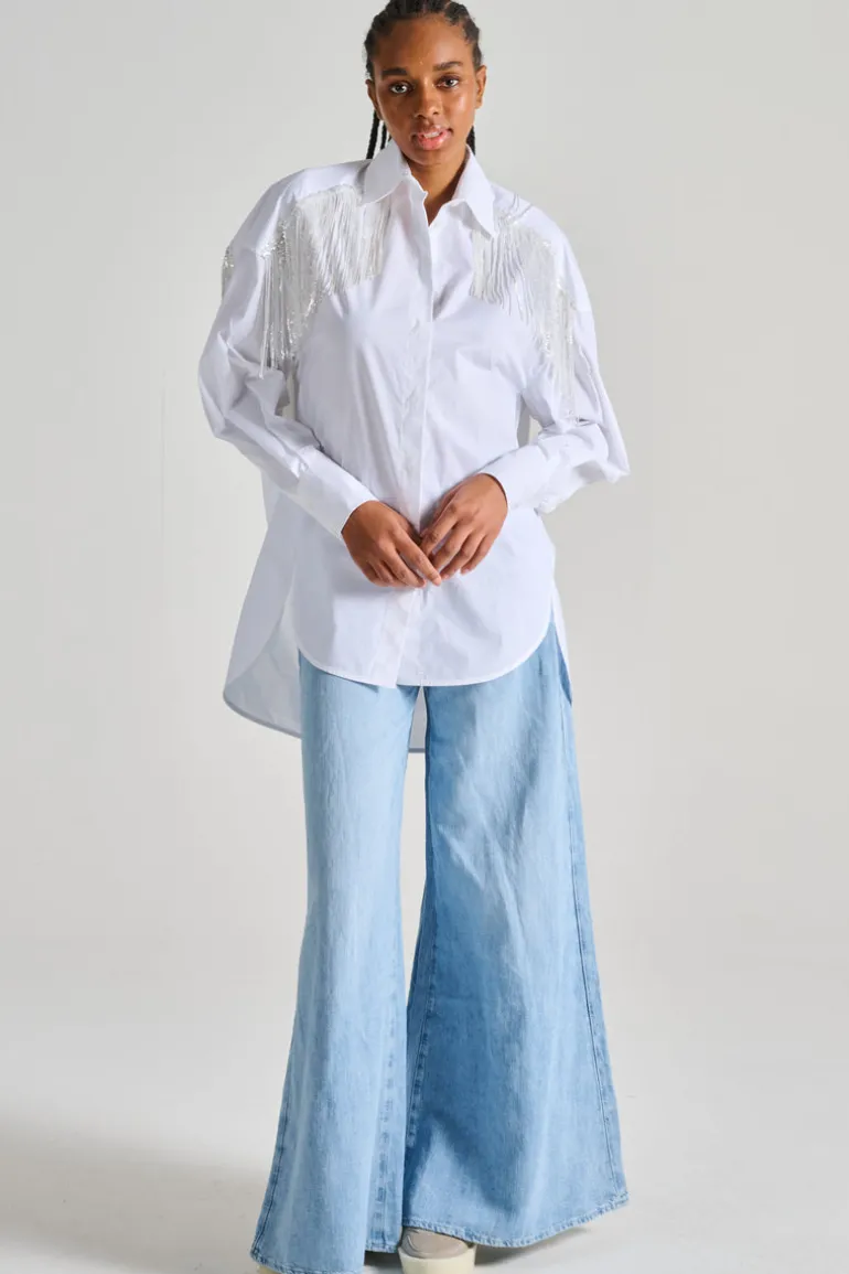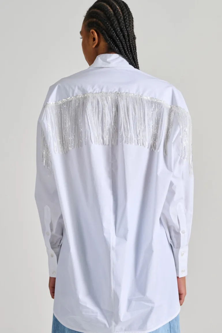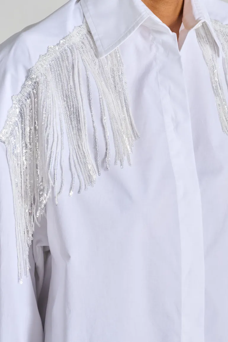 Scopri la camicia over-size di Dahlo, un’ottima scelta per un look elegante e alla moda. Questa camicia bianca è decorata con paillettes lucide e frange, rendendola perfetta per ogni occasione speciale.