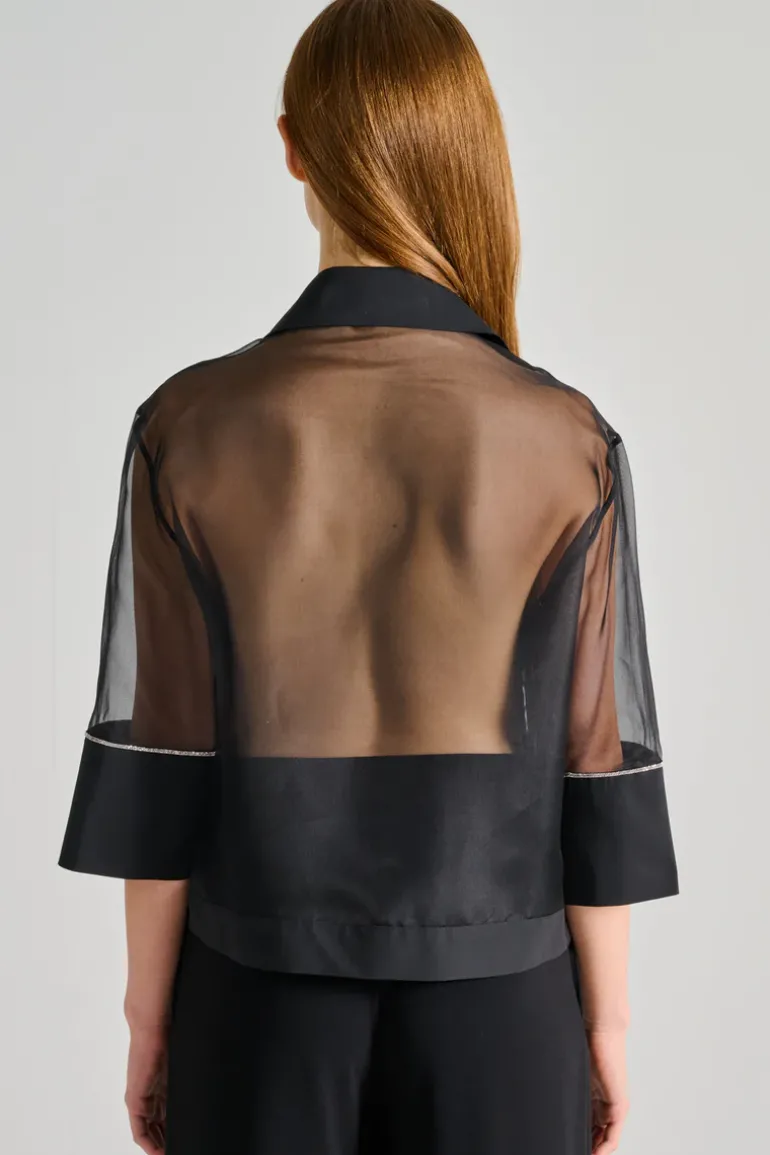 Il contrasto tra il popeline e l’organza offre una texture unica al tatto e alla vista, rendendo questa camicia un must-have per chi ama distinguersi con stile.
