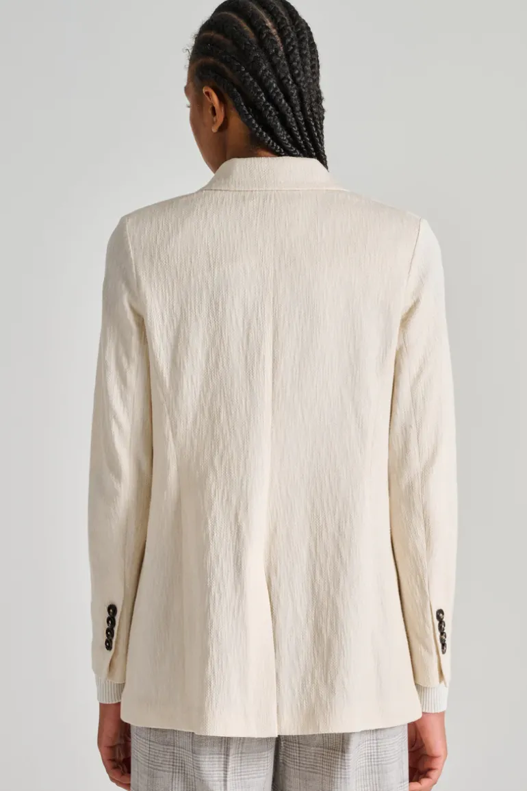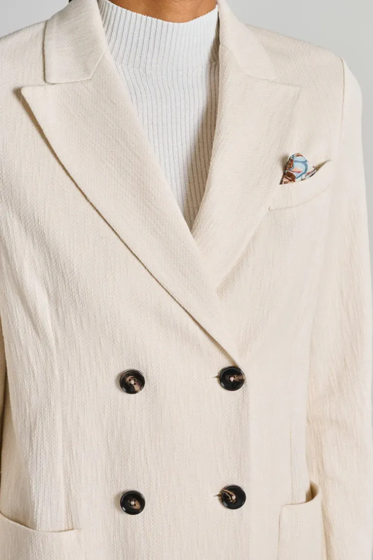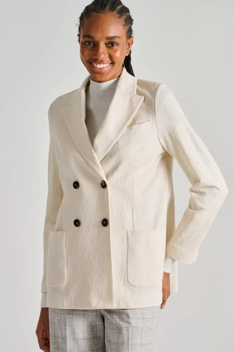 Scopri la giacca doppiopetto fiammato in bianco di Circolo 1901, un capo d’abbigliamento ideale per chi cerca eleganza e comfort nella vita quotidiana.
