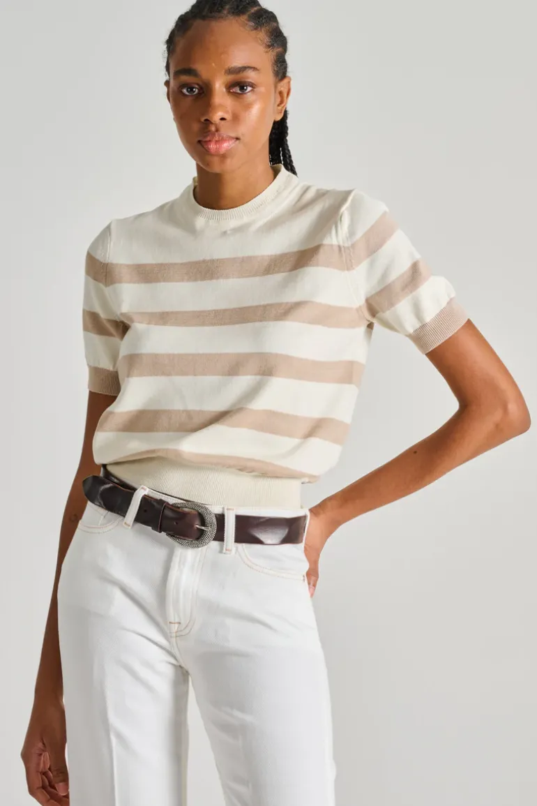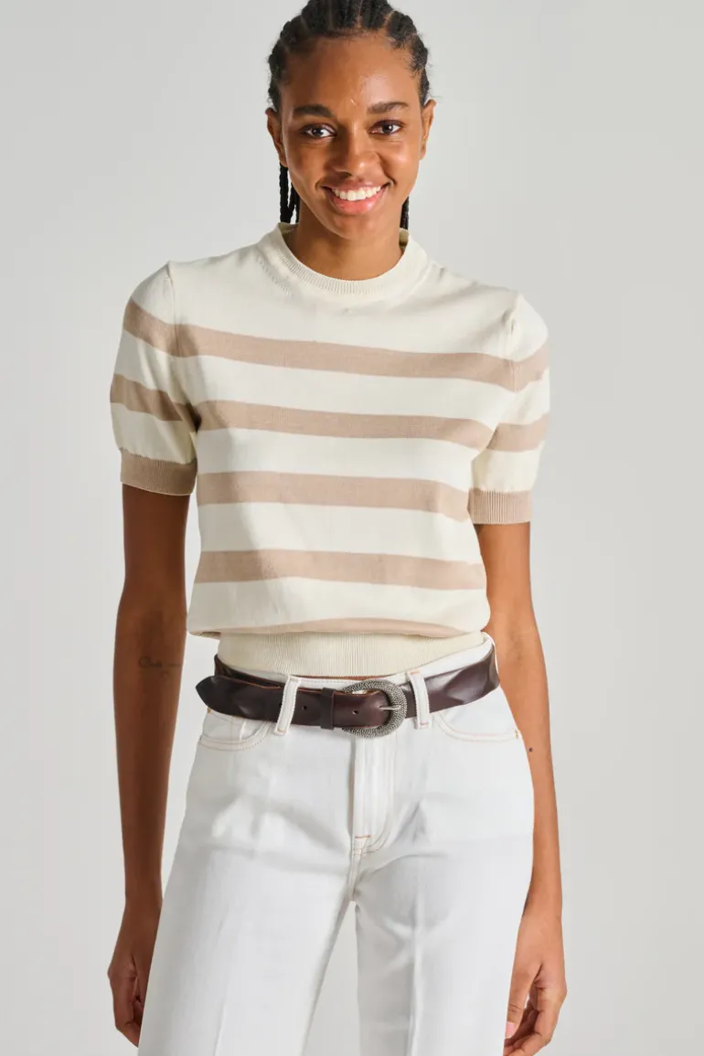 Questa maglia si distingue per la sua semplicità e versatilità, ideale per essere abbinata a diversi outfit, sia casual che più eleganti. La tonalità beige conferisce un tocco di classe e facilita la combinazione con altri colori. Perfetta per ogni stagione, può essere indossata sotto giacche o da sola per un look fresco e moderno. La maglia girocollo offre comfort e stile, adattandosi perfettamente alla silhouette femminile.