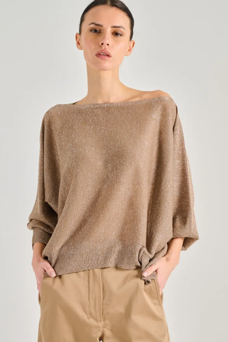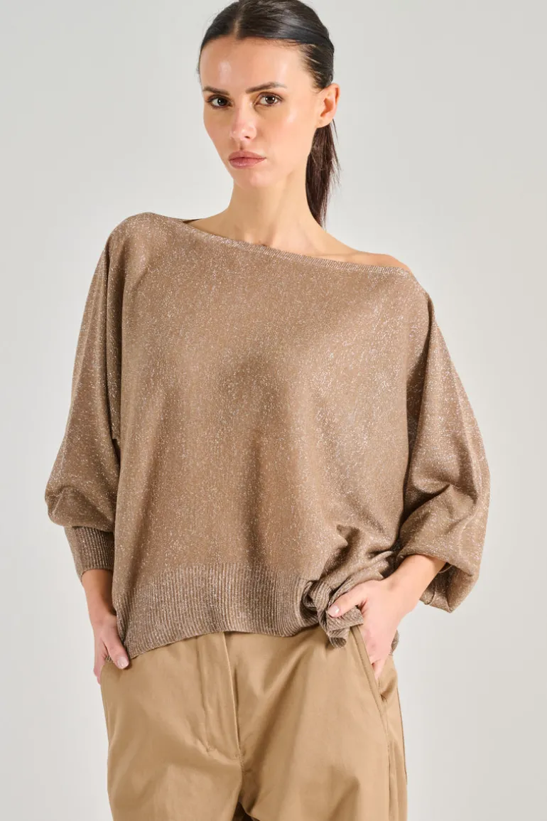 Grazie al suo design moderno e alla vestibilità over, questa maglia offre una silhouette elegante e un’ottima libertà di movimento. Adatta a diverse occasioni, può essere abbinata a pantaloni casual o a gonne più sofisticate. Non perdere l’opportunità di aggiungere un tocco di classe al tuo outfit quotidiano con questo must-have di stagione.