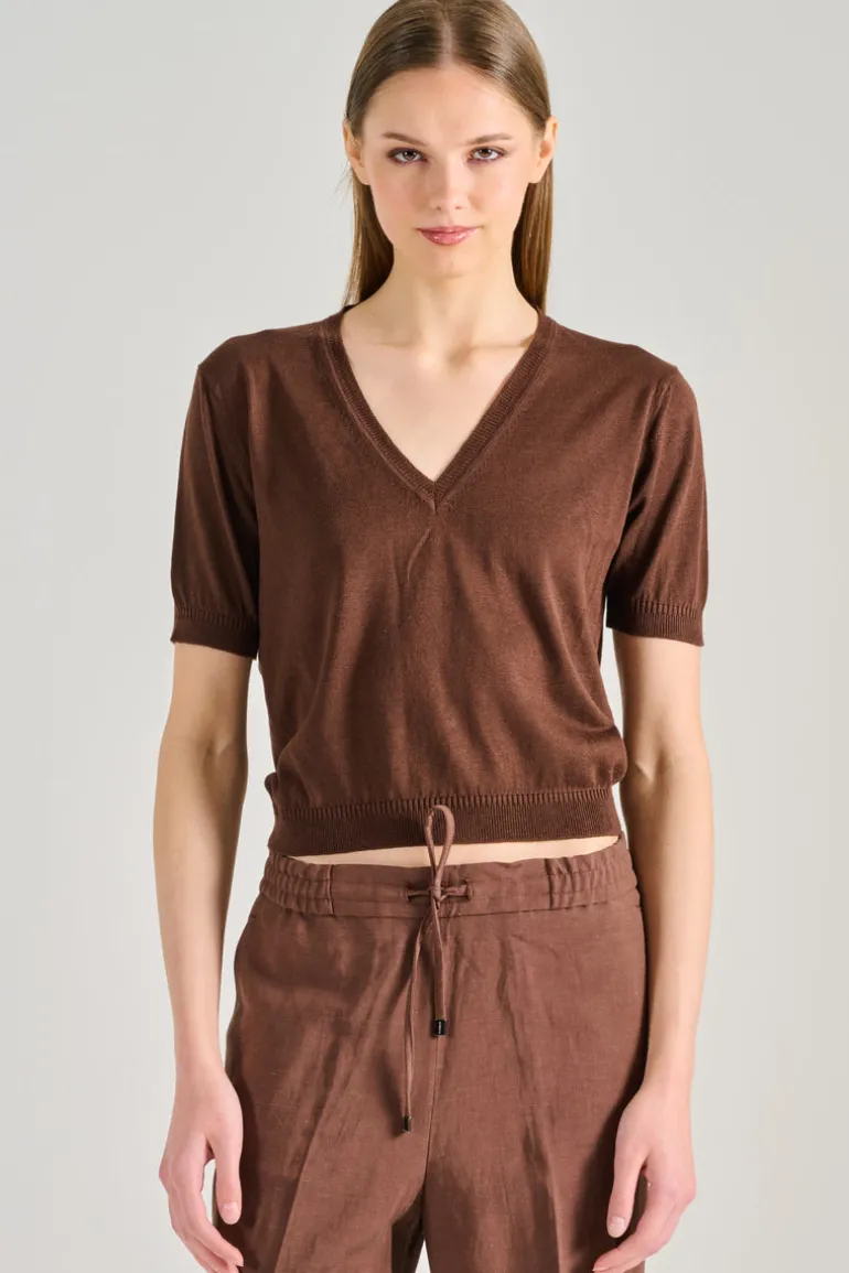 Scopri la maglia a scollo a V proposta da Cruna, un capo versatile e di tendenza che non può mancare nel tuo guardaroba. Il colore principale marrone la rende facile da abbinare con diversi outfit, perfetta per ogni occasione, dalle uscite casual alle giornate in ufficio.