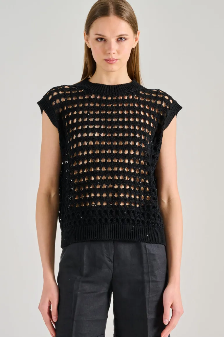 Questa maglia è ideale da indossare sia in contesti casual che più eleganti, grazie alla sua semplicità e al suo design moderno. La mancanza delle maniche offre una maggiore libertà di movimento, rendendola perfetta per le giornate più calde o per essere stratificata sotto giacche e cardigan nei mesi più freschi.